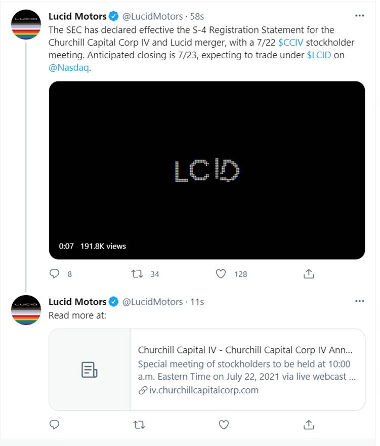 7월 22일 주주총회를 거쳐 26일 나스닥에 LCID 라는 티커로 상장될 예정입니다. (CCIV -> LCID)