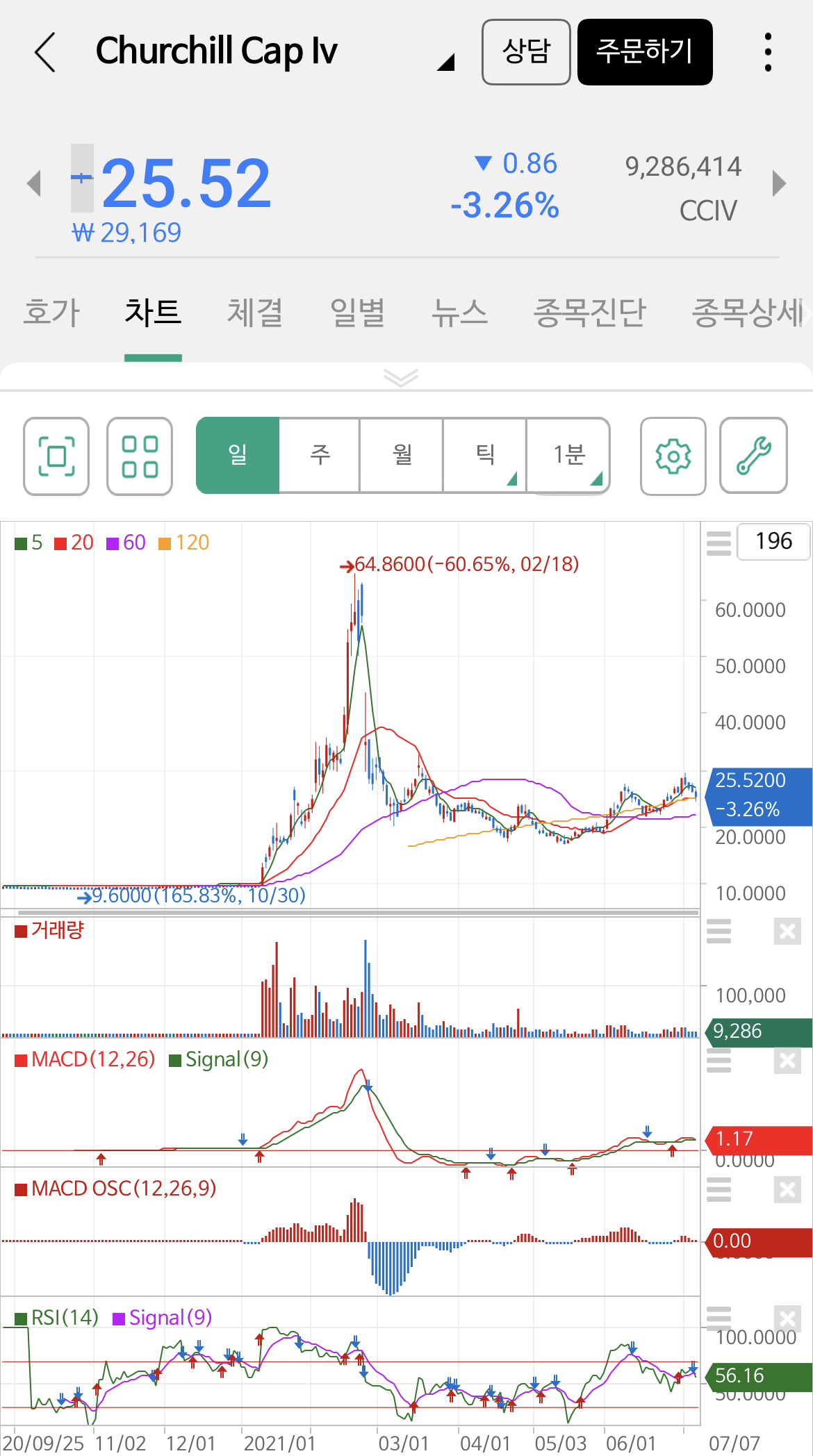 7월 8일 현재 주가는 25.52불로 120일선을 터치했네요 RSI도 준수한 편이고