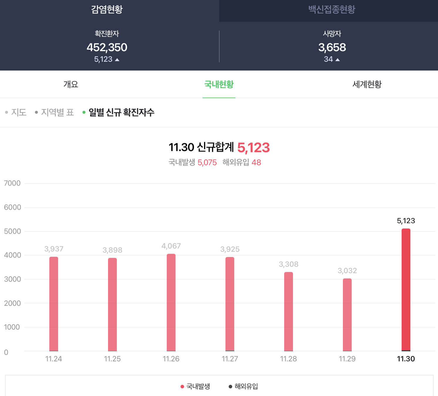 11월 위드코로나 시행이후 코로나 확진자는 계속 늘고있는 추세입니다.