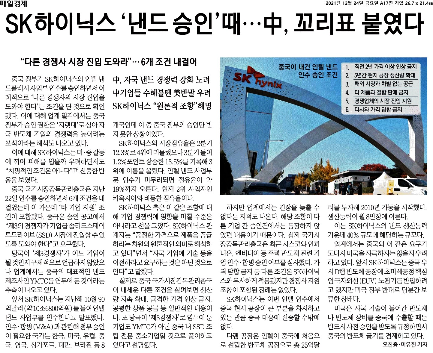 2021년 12월 22일 중국의 SAMR로 부터 인텔 NAND 및 SSD 사업인수에 대한 합병 허가를 받았다고 발표했습니다.