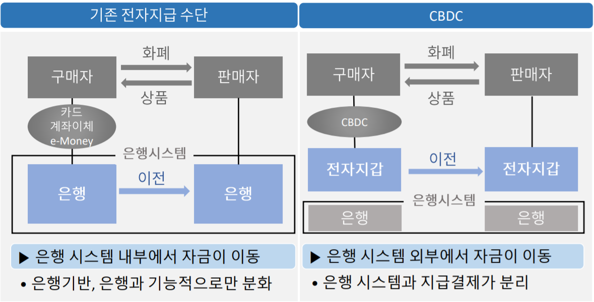 기존 전자지급 수단과 CBDC를 이용한 지급결제 비교