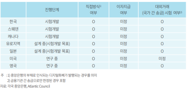 또한, 국가가 보증하기 때문에 일반 화폐처럼 가치 변동이 거의 없으며 현금과 달리 거래의 익명성을 제한, 정책 목적에 따라 이자 지급, 보유한도 설정, 이용시간 조절이 가능합니다.