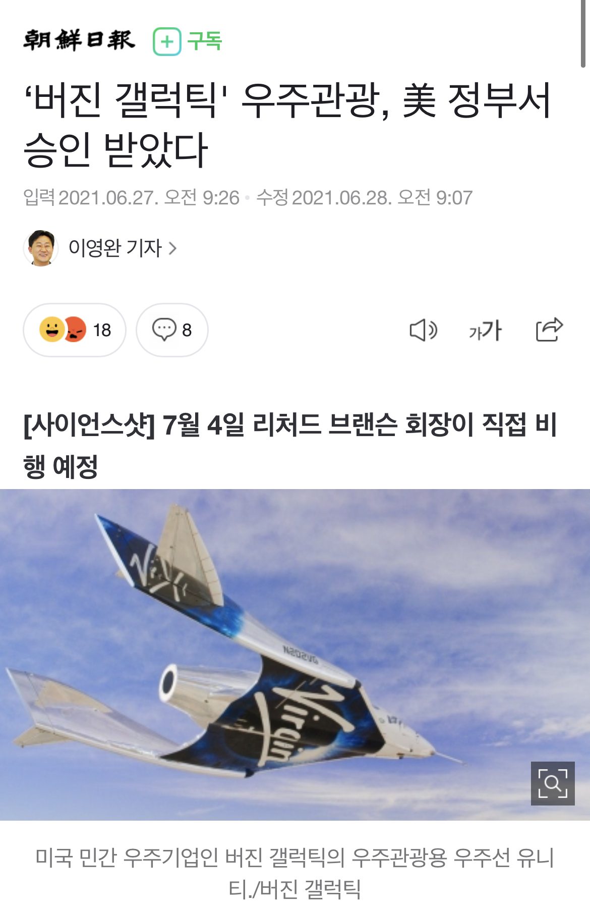 또한 7월 4일 리처드 브랜슨 회장이 직접 우주관광 비행에 나설 예정이라고 합니다.