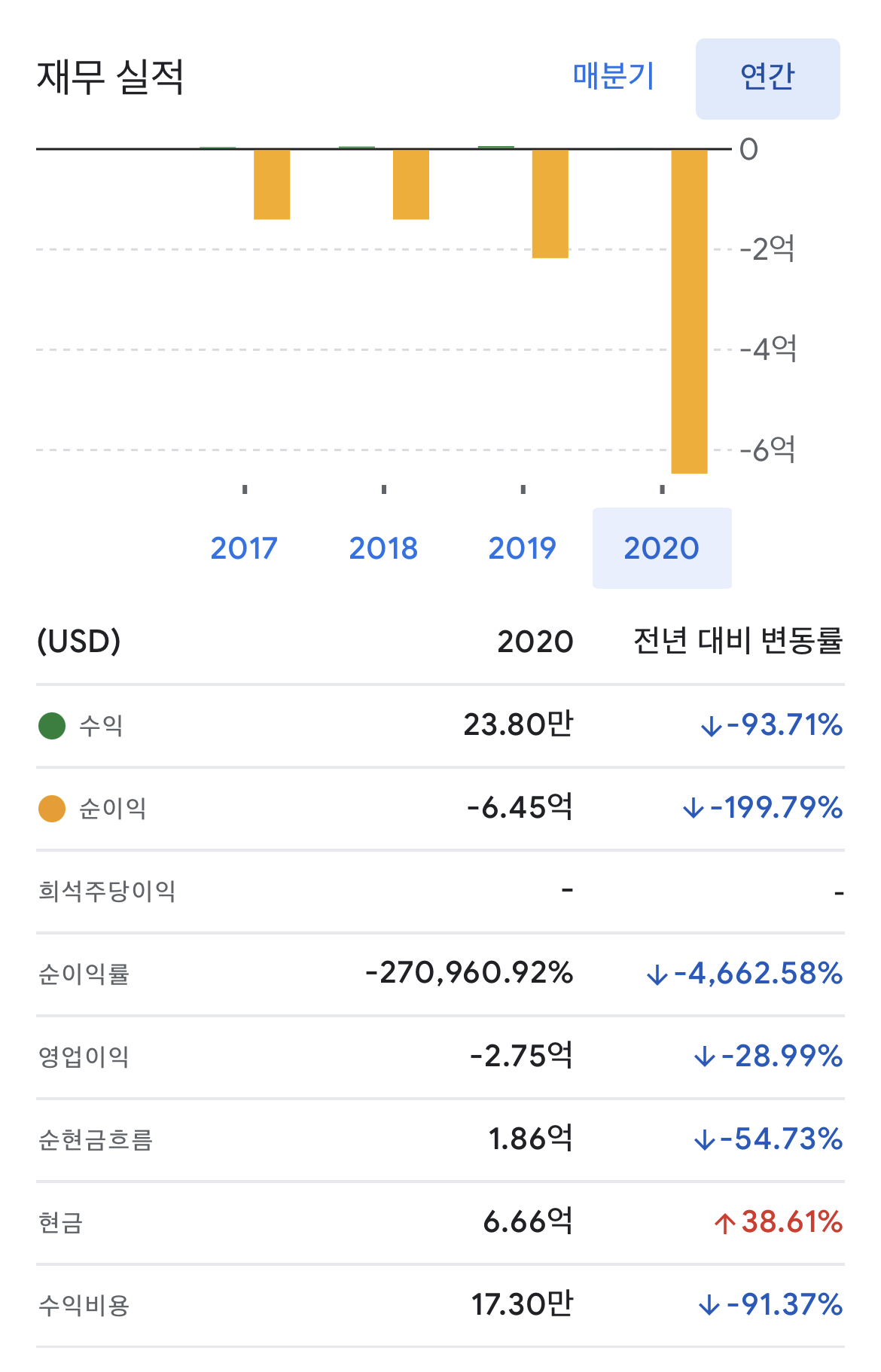 버진 갤럭틱 홀딩스는 아직 실제로 우주항공 사업을 개시하지 못하였기 때문에 실적이 나지 않고 있는